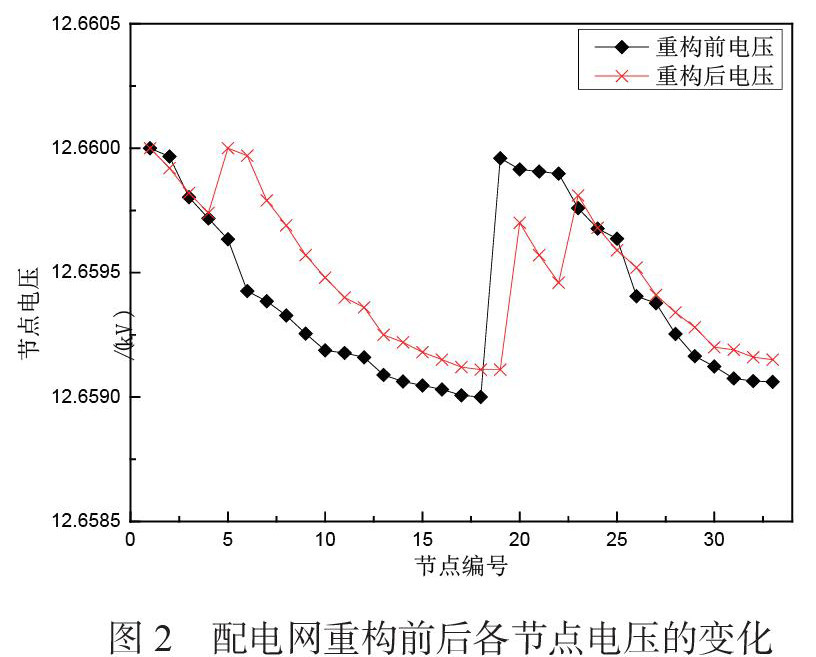 4)根据2.2节对配电网进行重构简化处理,得到有效解。根据2.3节所述前推回代算法对有效解进行潮流计算,得出目标函数(网损)适应值。