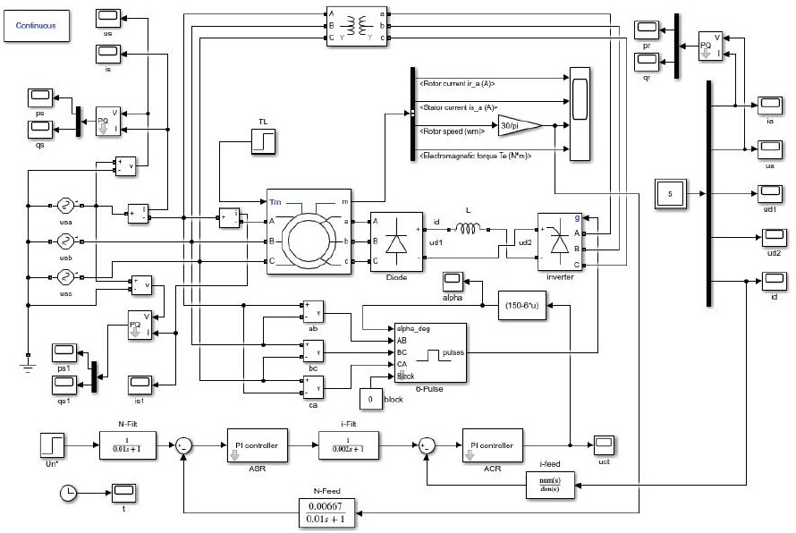 本文采用具有电流内环和速度外环的双闭环控制的串级调速系统模型图如下图所示,通过总线Bus Selector观察电动机定子和转子的三相电流、电机转速和转矩,用阶跃信号模块TL给定电机负载转矩。模型中还用三个功率测量模块Active & Reactive Power分别检测交流电源、电动机定子侧和变压器二次侧一相的有功和无功功率,以便比较串调系统的功率流向。系统由转速调节器ASR和电流调节器ACR组成双闭环PI控制,转速反馈取自电动机检测模块,电流反馈信号取自平波电抗器L的电流检测信号id,转速信号由阶跃模块Un*给定。