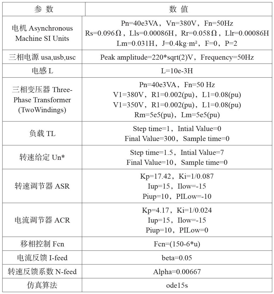 电流环按典型I型系统设计,转速换按典型II型系统设计。根据系统动态模型图,运用 MATLAB/simulink 仿真软件搭建绕线式异步电动机双闭环串级调速系统仿真。设置仿真参数如下。