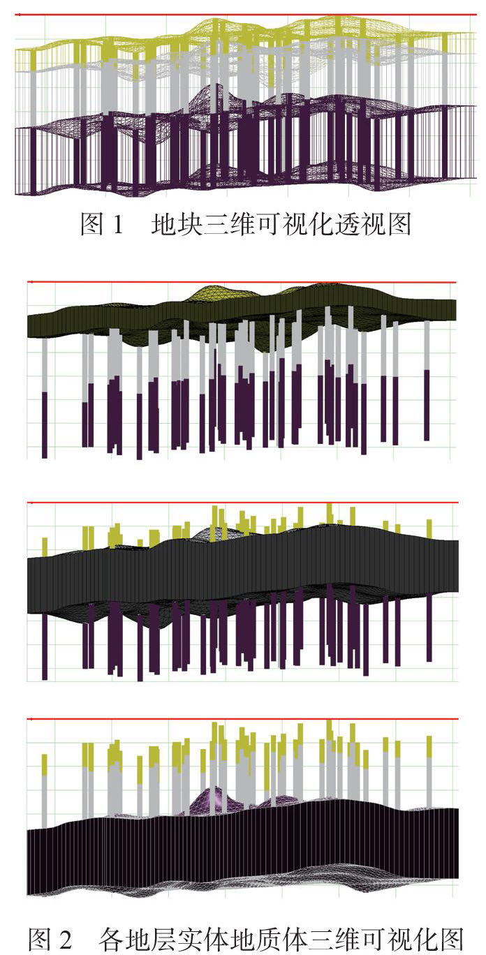 将ArcGIS处理好的地块边界导入GMS软件,确定好模型建立的坐标系,再根据指定地块边界生成TINs,将优化好的钻孔数据导入Borehole模块中通过在模块中选择Horizons→Solid命令,采用克里金插值法,自动生成地质实体,从而建立地层地质体实体模型(图1)。我们可以根据地块实际情况查看各地层展布状态,还可以从不同角度观察地层模型的结构。