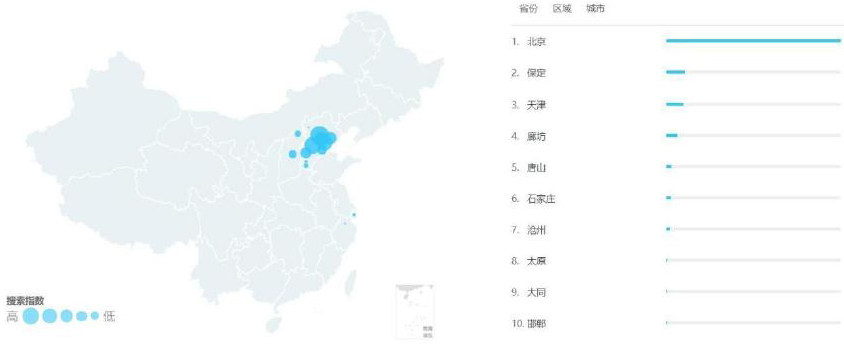 在百度指数中的人群画像类目下,将时间范围调整为近一年,可以很明显看到华北一带搜索指数最高,华中和华东各占少部分,其他地区搜索指数相比都很低。