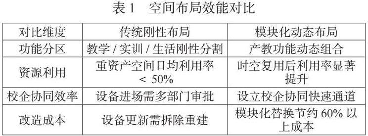 校园空间资源配置存在显著时空割裂现象,精密仪器室、数据中心等重资产空间日均利用率不足 50%,教学时段与企业生产时段的刚性划分,导致价值数百万的检测设备闲置,跨专业资源共享机制缺失,机械加工中心的机床仅在特定课程开放,电子信息专业师生无法借力完成精密零件加工[1]。更值得关注的是部分院校引入企业生产线后出现“双重标准”困境,这种割裂与低效不仅浪费了宝贵的教育资源,也使得校企合作难以深入,阻碍了产教融合的推进,限制了学生实践能力的培养和产业技术的创新,对职业教育的高质量发展形成了制约。
