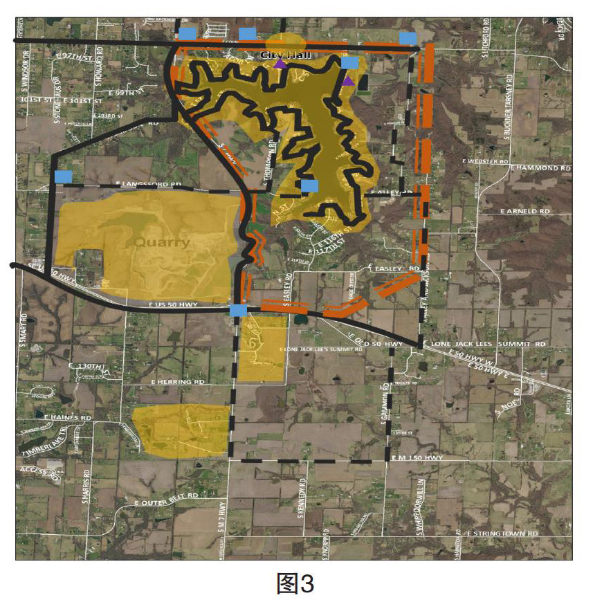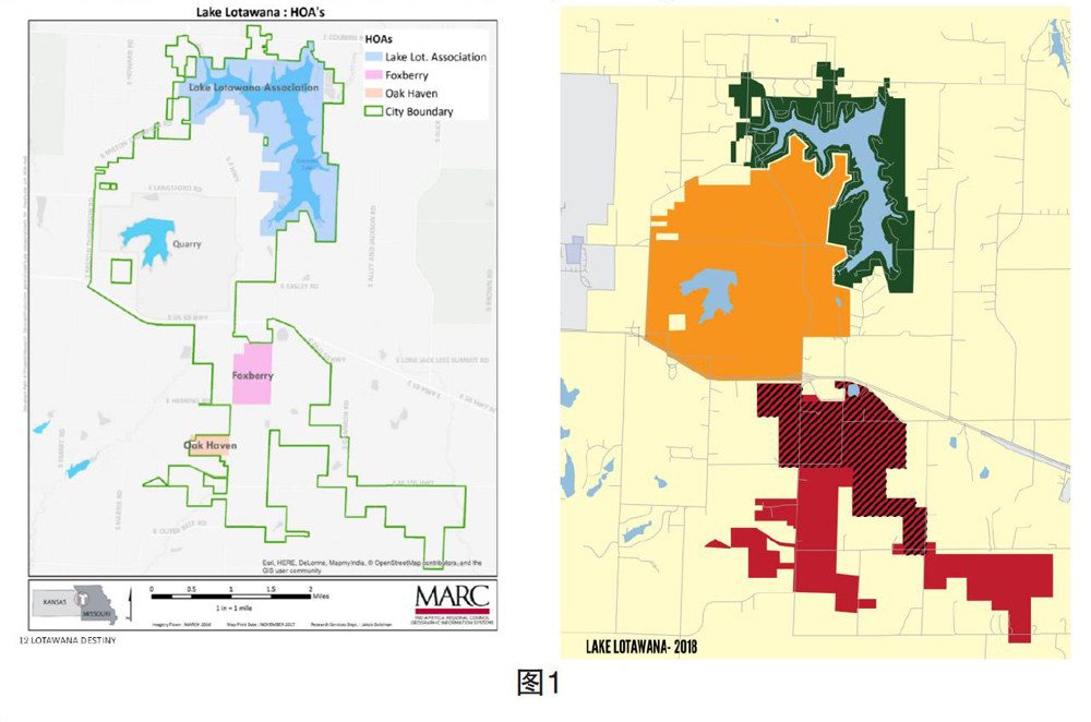 本项目名为“Lotawana Destiny”。是堪萨斯大学2015级城市规划研究生以及教授、MARC(Mid-America Regional Council)工作人员、Lake Lotawana政府以及居民为Lake Lotawana编制总体规划的项目。Lake Lotawana位于密苏里州。Lotawana以印度的一位公主命名,意为“冒泡的水”,占地29.24平方公里[29]。但是随着与周围土地的不断合并,占地面积已经扩大至原来的二到三倍。如图1所示,绿色的为Lake Lotawana的原始区域,而橙色和红色为后来合并的区域。