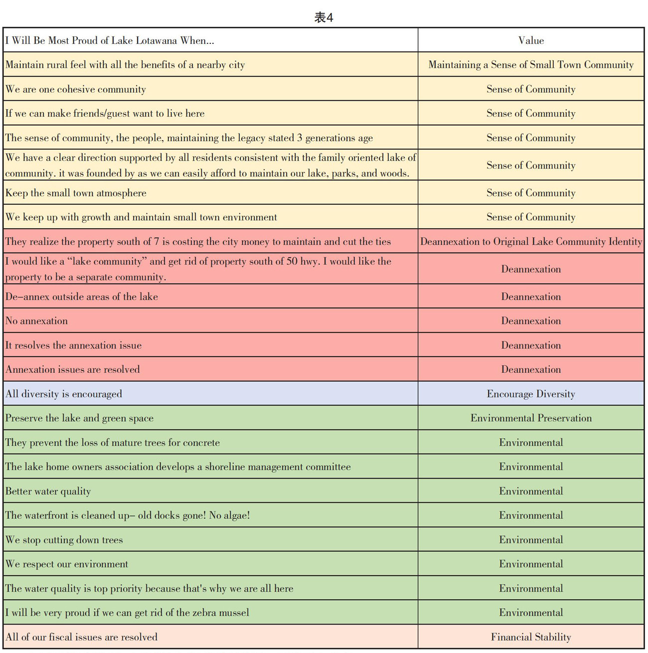 (1)展望未来(Visioning):让居民用便利贴不署名填写对未来的展望,并在白板上展示,最后对所有答案进行投票。我们将所有答案的中心思想进行提炼、简化、分类,如(见表4):