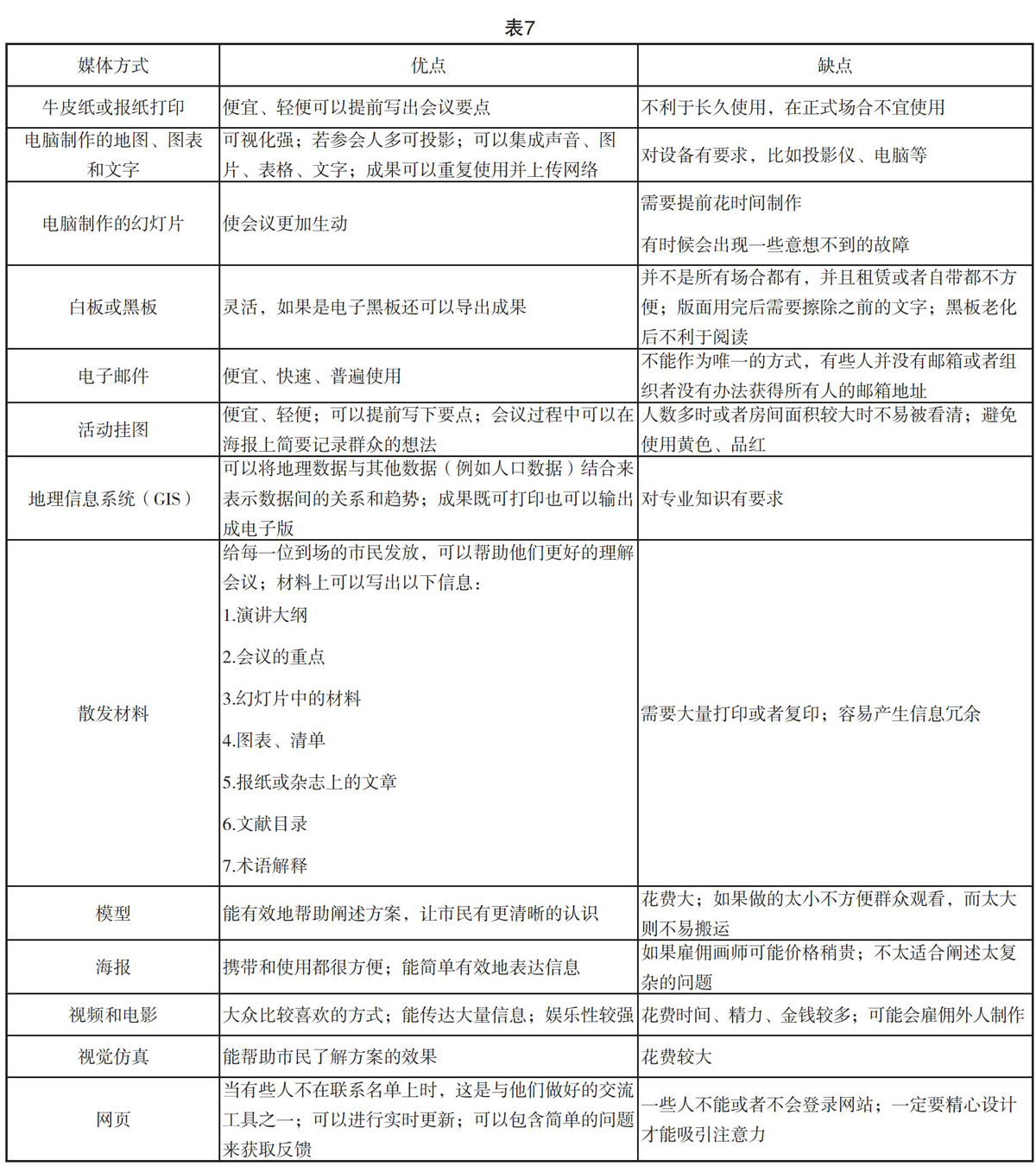 (二)规划师要善于用各种手段来表达规划方案。随着科技的进步与各种传媒手段的发展,海报、视频的制作已经成为了规划师的基本功。枯燥的文案经过艺术渲染使普通民众更愿意去了解,并且也能打破专业壁垒,使民众更好了解规划方案的含义,这样才能从根本上提高公众参与的积极性。根据Elaine Cogan的《Successful Public Meetings》的指导,列出以下为几种常见的辅助手段及其优缺点(见表7)[32]: