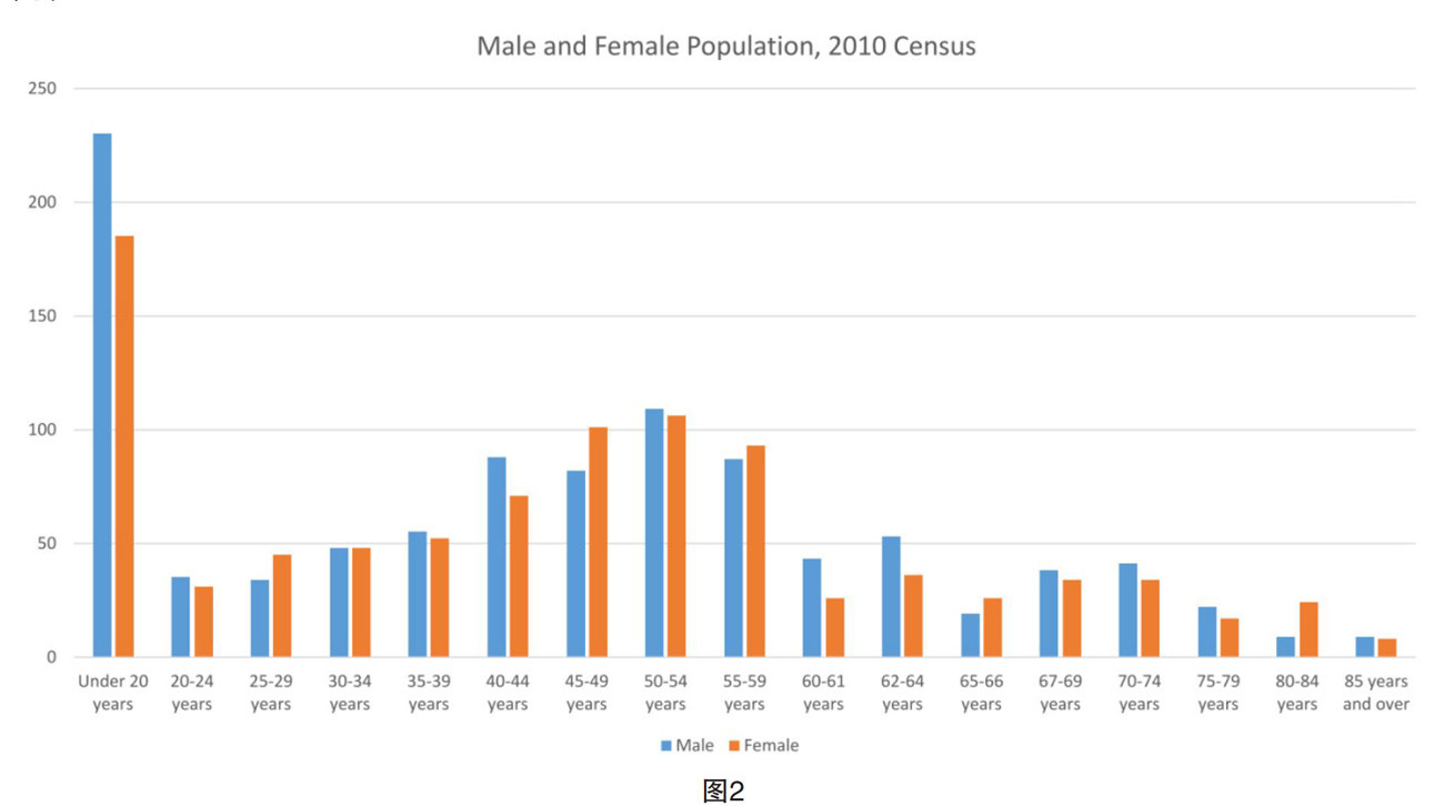 以下是2010年Lake Lotawana的人口普查数据(见图2)。可见,20岁以下的年轻人占了很大比例,男女比例基本平衡。