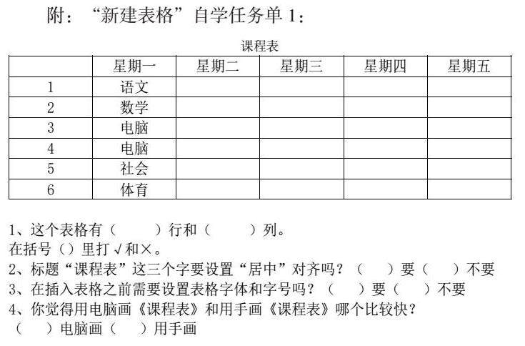 如:学习新建表格时,我会使用最熟悉的课程表作为案例让学生对新建表格的工具进行探究学习。同时,我会设计一个简单填空、判断题型为主的“自学任务单1”来引导学生学习“新建表格”这个微课。第1题是让学生填写新建表格的行列数。数行列数可能对于正常小学生来说已不是问题。但是由于我们这些特殊孩子,同学们之间听力受损程度不同,智力程度也会有较大的差异。有些学习比较慢或观察不细致的学生在新建表格时没有认真数清楚行列数,会导致在练习“新建表格”时出现插入行列数不足的现象而不自知。当他们发现自己的表格出错时,却要面临需要通过增删行列数等新的操作技能才能完成正确的课程表的创建,导致操作步骤变得复杂化,需要花费更多的时间。这些失误造成的操作困难会大大消磨他们学习积极性,增加学习挫败感。因此,“自学任务单”的第1题,我就清晰地把表格成品展示出来,让学生对他将要新建的表格的具体行列数要有清晰的认识。同时也让他们明白到以后自己在新建任何表格前都应该考虑好新建的表格需要多少行多少列,便于以后操作。接着,根据教学重难点设计几道简单的判断题。如“自学任务单1”中的第2和3题可以判断学生都没有关注到微课里的细节点。这也是以往学生在操作时常可能会遗忘或出错的步骤,故利用“自学任务单”的判断题向他们提出来,促使他们在看微课时关注这部分的操作。第4题是学生的主观感受反馈,可以得到学生对使用电脑绘画表格的兴趣度的反馈。看似简单的4题,学生几分钟就可以完成作答了,同时老师也能从中很快地了解到各个同学对微课学习的深度和对本课内容的兴趣度。