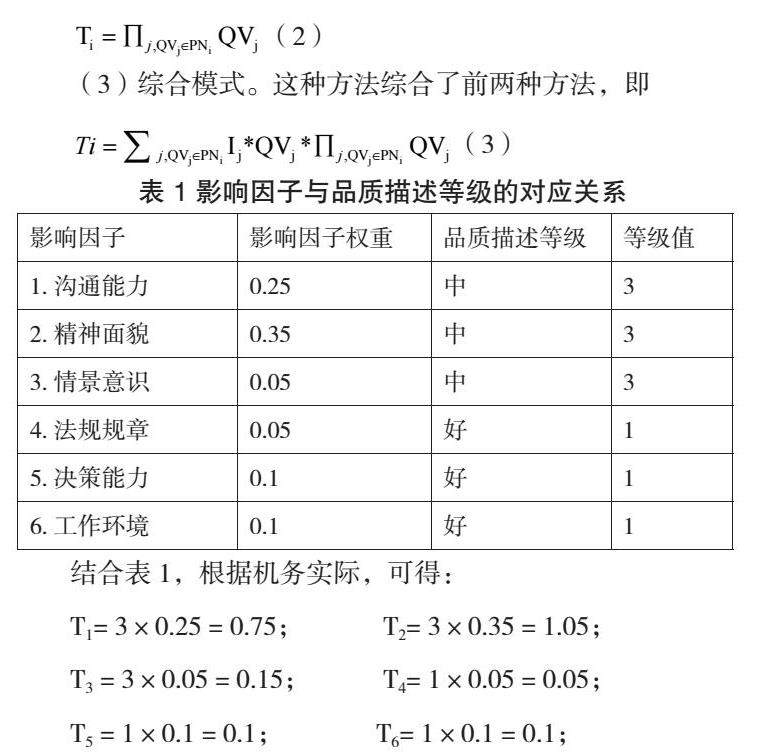 影响因子确定之后,利用AHP层次分析法确定各自的权重值,根据以往的专家经验,结合相关文献,可以得到:机务的沟通能力权重值为0.25,精神面貌权重值0.35,情景意识权重值0.05,行业规章权重值0.05,决策能力权重值0.1,工作环境权重值0.1。