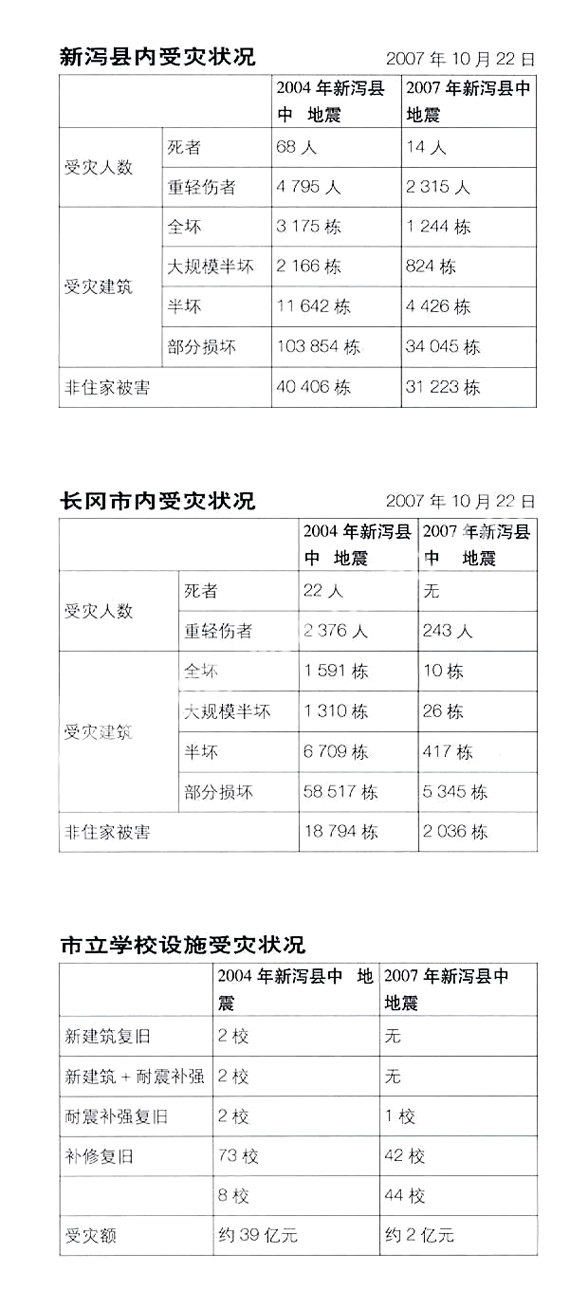 长冈位于新泻省中部,夏季凉爽多雨,冬季寒冷多雪,冬季积雪量达到25m。因此建筑设计需要考虑雪荷载的作用。2004年10月23日17点56分新泻省中部发生了6.8级地震,最大烈度为7度,受灾人数10万人。2007年7月16日10点13分新泻省中越冲发生了6.8级地震,最大烈度超过6度,受灾人数1万人。有关两次地震对长冈市建筑物和人员的伤害见表。