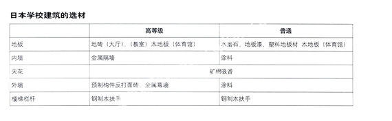 日本学校内部的装修和选材材给人的感觉是,环保,实用,耐久,没有额外的装饰,每一个细部都有在功能上的考虑,令人感动。例如,在学校的建材中,我们很少见到过石材装饰,这是由于石材要进口,日本人对自己的国土珍爱备至,不会去砍哪怕一棵树,因此更不会开山去挖石材;大部分的建筑物是面砖外墙,对于学校而言,由于粘贴瓷砖有可能脱落,因此有很多是涂料外墙,而面砖的外墙多是预制混凝土反打,这种技术在日本已相当成熟。虽然日本的学校单方造价比我国要高很多,约30000元(人民币)/m2,但是可以看到,每一分钱都落在实处,各种消防设施都整齐划一,每一个栏杆扶手都极其人性化……卫生间简洁易于打扫。学校的清洁工作往往是学生来做,耐用和易于清洁则更加重要,正是由于这样的设计和后期的妥善维护,才使得日本的学校经久耐用,学校建筑的平均寿命不断增加。