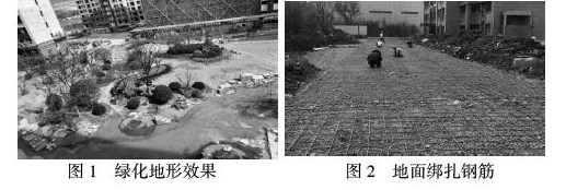 此次园建部份基础结构主要有:原来、小广场、景墙、水景、平台、廊架、围墙等等,按照设计分项施工图纸进行分项施工,根据每个分项的节点做好每层基础垫层,着重在于基层土质压实度,要实事求是地跟踪管理,若遇到软基础土质,要提出更换方案及措施,不能忽视,以防日后下沉,导致面层破裂返修产生。土方基层夯实后,铺设级配碎石垫层,然后支撑模板、绑扎钢筋(见图2)、浇筑混凝土基础结构,做好养护维护管理(见图3)。