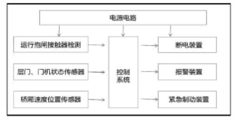 电梯轿厢意外移动保护装置一般由以下三部分所组成 检测子系统、制停子系统、自监测子系统,以此对轿厢的运行速度和实际位置进行检测,制停轿厢,并能够定时定期监测制动器的制动力是否符合要求以及抱闸接触器检测开关的状态。除此之外,控制系统在接收意外移动的信号之后,断电设备、紧急制动以及报警设备可以根据信号完成相应的动作[1]。