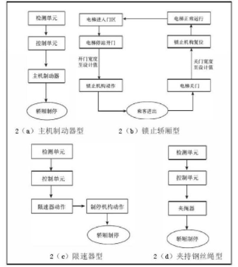 从总体的角度来讲,该装置主要有三部分构成,分别为检测子系统、制停子系统和自监测子系统。在这其中,首先是检测子系统,其主要作是检测轿厢是否有意外移动的情况发生。通常情况下,对于这种检测系统精度和速度的要求较高,对于是否出现意外移动情况的检测预警最迟也要确保是在电梯离开开锁区域之时,从而及时触发制停子系统制停轿厢防止意外移动。正因为如此,在将其正式投入使用之前,相关工作人员应该对其进行试验,从根本上保证该系统的作用和价值能够得到最大程度地发挥。其次是制停子系统可以作用在轿厢、悬挂钢丝绳、对重以及曳引轮等。如果制停装置作用在轿厢,则可以利用轿厢的安全钳对电梯进行制动,使电梯轿厢能够立即停止向下移动。如果制停部件作用于钢丝绳,则可以利用钢丝绳制动器完成制停的动作,如果制停部件位于曳引轮就可以直接制动曳引轮从而制停电梯,以上几种类型的制停子系统是针对有齿轮曳引式电梯设计的具有结构原理简单成本低的优点。再者就是冗余的制动器作为制停子系统直接制停轿厢,此类制动器也是电梯运行的工作制动器只要电梯运行就要打开或闭合动作平凡,容易发生闸瓦磨损弹簧变松等损耗从而影响制动力,故用冗余的制动器做为意外移动保护装置的制停子系统时需要设置自监测子系统来监测制动器的正确提起或释放以及制动力是否满足要求。这里制停子系统及自监测子系统一般运用在无齿轮电梯中。