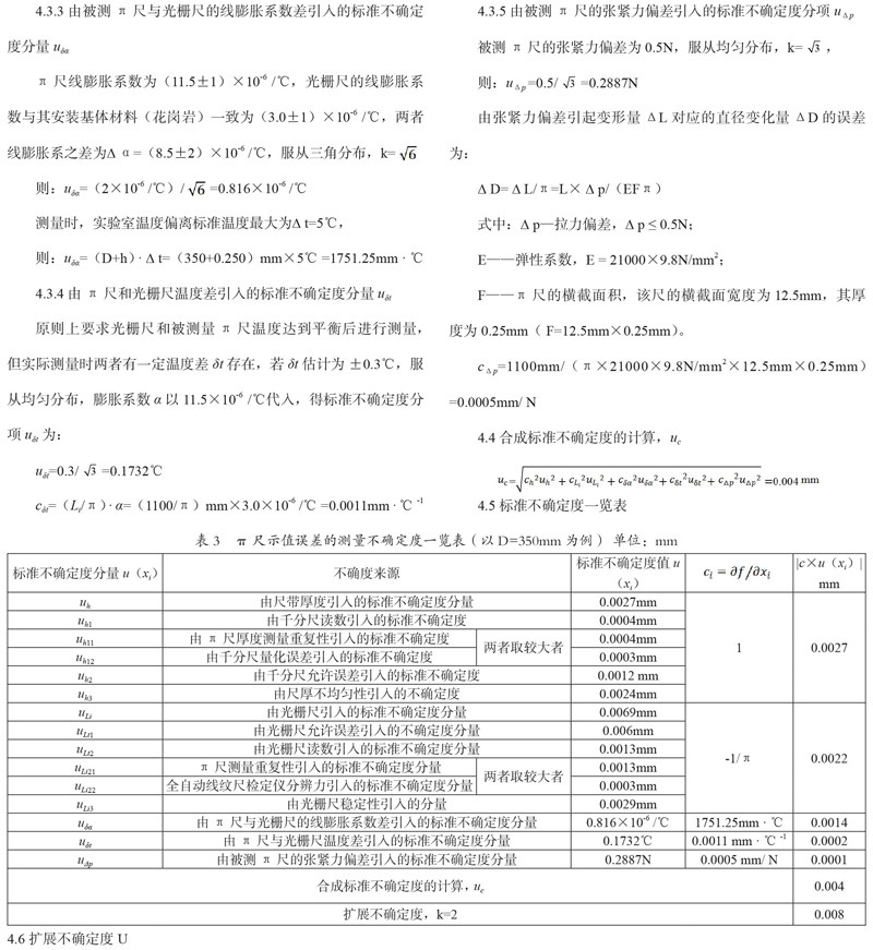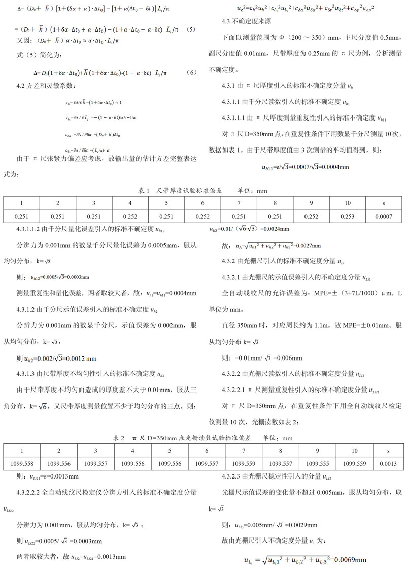 下面以测量范围为Φ(200~350)mm, 主尺分度值0.5mm,副尺分度值0.01mm,尺带厚度为0.25mm的π尺为例,分析测量不确定度。