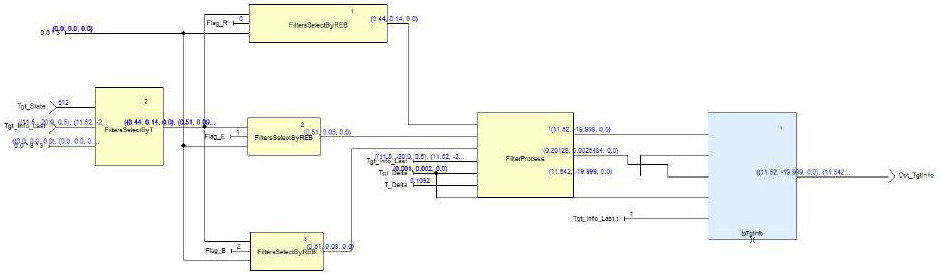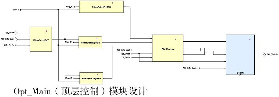 根据软件流程图,将滤波跟踪模型划分为3个Operator:FiltersSelectByT(根据目标跟踪周期选择滤波系数组)、FiltersSelectByREB(根据距离角度标志选择滤波系数)、FilterProcess(滤波跟踪处理)、Opt_Main(顶层控制)。