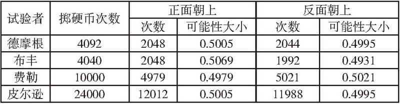 活动一: “掷硬币”实验。通过掷硬币得出正面朝上和反面朝上的可能性大小。以小组合作的形式开展,探索掷硬币正面朝上和反面朝上的可能性大小。并用多媒体课件对历史上数学家们掷硬币的实验结果展示: