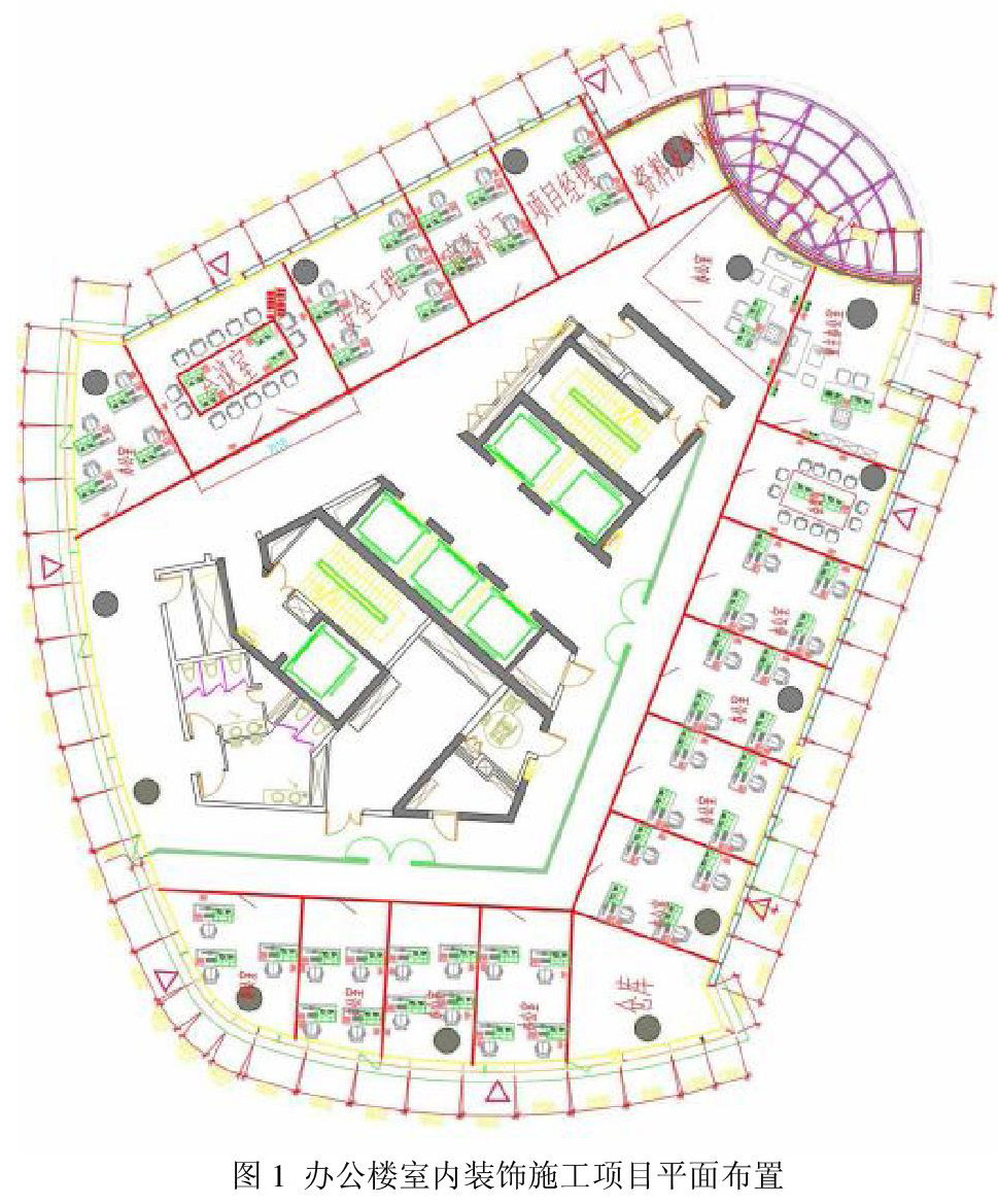 一个办公楼室内装饰施工项目为总高度80m的高层建筑,地上建筑面积为17995m2,楼层为17层,该办公楼室内装饰施工项目平面布置见图1。办公楼室内装饰施工项目的施工内容为:地面白色大理石、地毯、顶层石膏板吊顶、GRG镜面电镀不锈钢、墙面阳极氧化金属板、墙面白色大理石、金属格栅、墙面灰色硬包与无机涂料等。工程质量要求一次验收合格率达到100%。