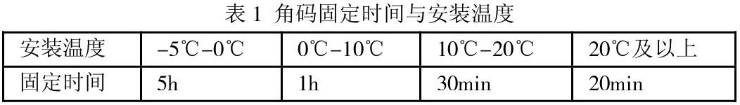 如图3所示,在测量放线的基础上,技术人员应利用化学锚栓锚固方式,安装锚栓并加入凝胶,待凝胶药剂硬化后固定角码。角码固定时间与安装温度存在一定关系(见表1)。