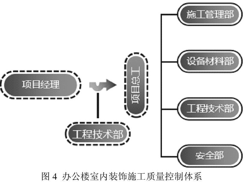 组织保障是办公楼室内装饰施工质量控制的前提。作为质量保障体系第一责任人的项目经理应协同项目技术总工建立质量组织保障体系(见图4)。