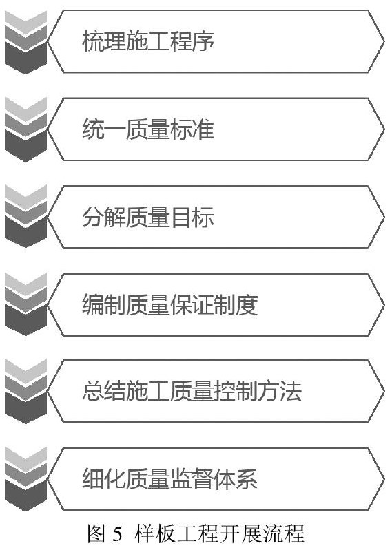 样板先行是办公楼室内装饰施工质量控制主要用手段,可以检验工艺操作者水平,固化高质量施工工艺,并预先同一施工质量控制标准。因此,应根据图5所示样板工程开展流程,进行样板施工,解决部分复杂室内装饰正式施工难题。
