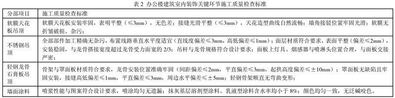 三级检查是办公楼室内装饰施工质量控制的必要手段,可以落实全过程质量标准化管理方针,确保上一道工序与质量标准相符。三级检查主要是由操作者自检、施工班组互检、技术人员专检共同进行每一道施工工序检查,只有上一道工序与质量要求相符才可进行下一道工序施工,关键环节检查标准见表2。其中施工班组互检即由相关各专业工种之间交接检验并形成记录。对于检查期间发现的瑕疵,则借助快干便携贴标识,促使各专业明了自身质量问题,在规定时间内修整[7]。