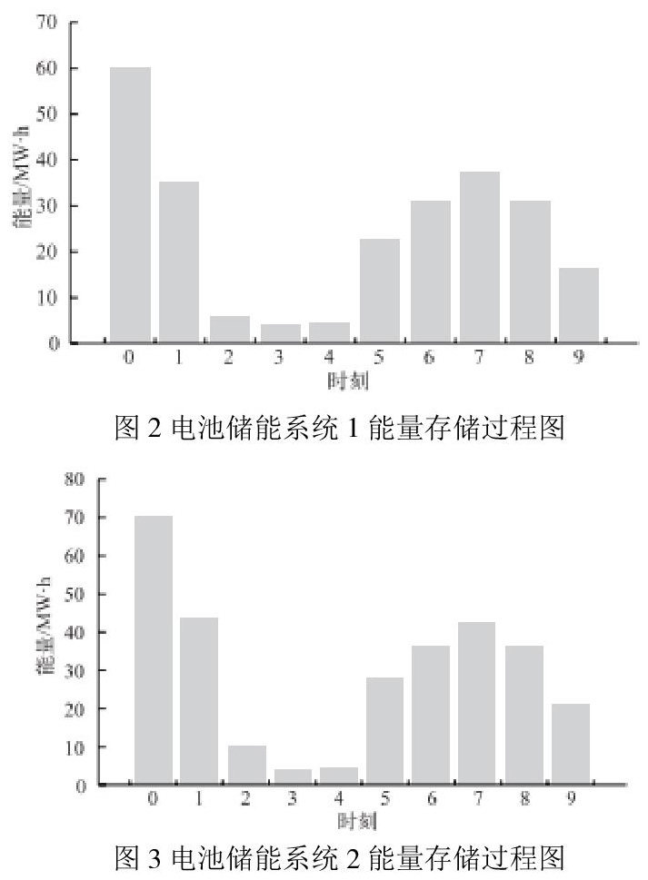 各个时间节点智能楼宇群与供电侧的电能平衡情况如图2和图3所示。可以看出,智能楼宇群的可控总负荷、发电机组总输出与储能系统充放电情况根据不可控总负荷变化而变化,且每一时间节点最优调度下的不平衡功率都为0。在时间节点5,当楼宇内不可控总负荷减少,而发电机组输出功率受最大向下爬坡功率限制导致供给电能盈余时,储能系统进行充电并且可控负荷用电量上升。同时,由于储能系统不计算运行成本,所以供电优先级高于发电机组。