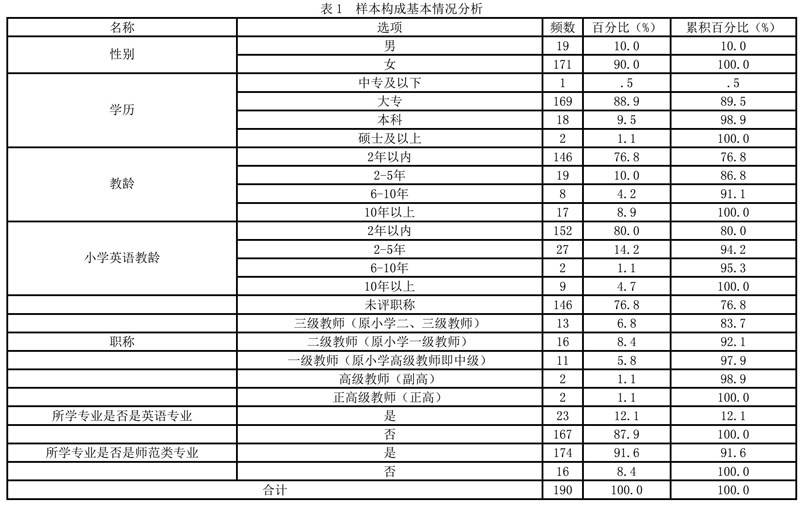 调查采用李斯特5级量表法计分,针对反向题目(完全不符合、基本是不符合、有些符合、基本上符合、完全符合)赋值1,2,3,4,5计分,得分越高,表明该项指标反映的相关性越高。本研究的调查样本选取广西民族师范学院教育科学学院2018级小学全科五年制初中起点190名学生以前所在小学的1名小学英语教师为研究对象,通过问卷星进行问卷和数据的收集。