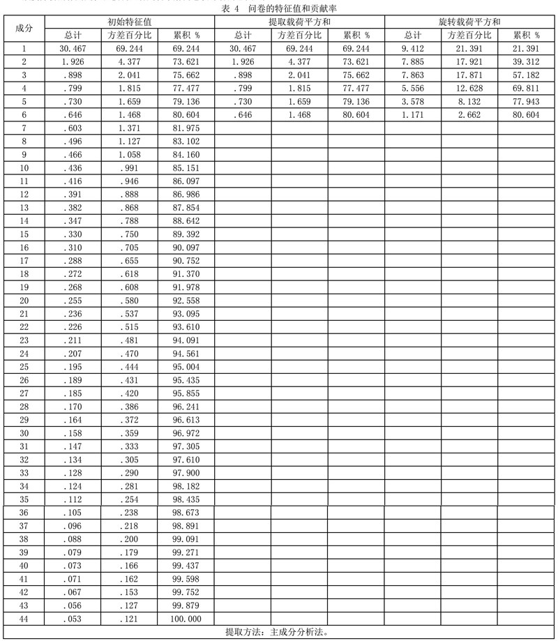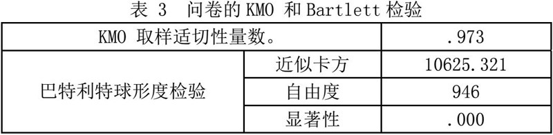 从表3可知,问卷的效度指标KMO的检验值为0.973,大于0.9,说明问卷非常适合做因子分析;Bartlett检验的P值为0.000,小于0.05,说明可以做因子分析,问卷有效。