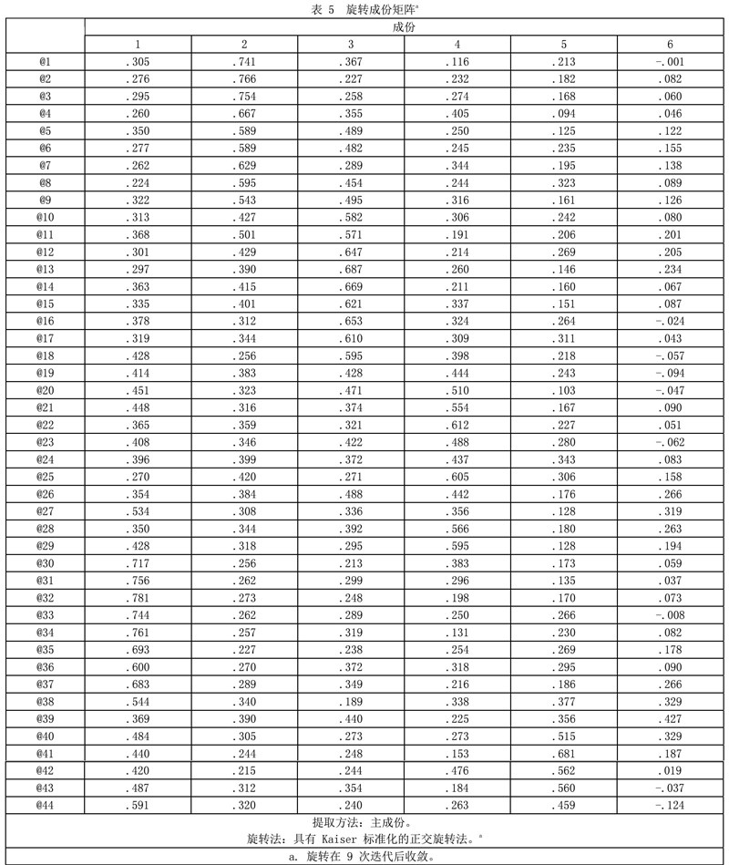 由表4结果可知,前6个公因子的特征值均大于0.646,根据公因子的选取原则,前6个公因子的累计方差贡献率为80.604%,故能基本概括整个数据表的信息,研究数据具有良好的结构效度水平。为使变量因子尽可能向两极分化,采用Kaiser 标准化的正交旋转法对变量因子做载荷旋转,旋转后的变量因子载荷矩阵数据见表5。