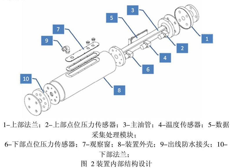 双点差压式变压器智能油位异常监测装置采用高性能的通用型硬件,实时采集和边缘计算,发现油位异常,实现在线预警。装置主要由高精度的压力传感器、温度传感器、数据采集处理模块、主油管,以及外壳、上下部法兰、观察窗、出现防水接头等部分构成,装置的内部结构设计如图2所示。