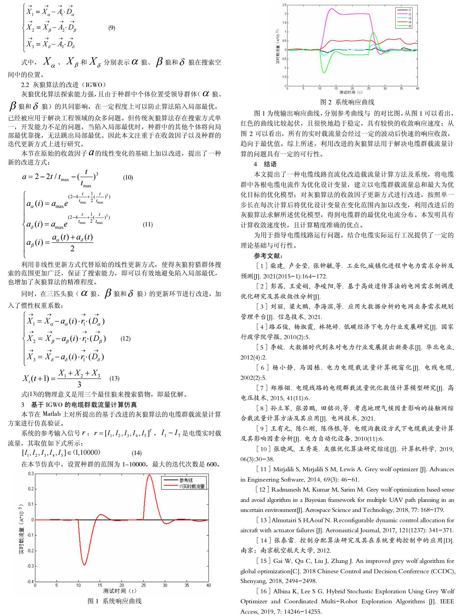图1为统输出响应曲线,分别参考曲线与 的对比图。从图1可以看出,红色的曲线比较起伏,且很快地趋于稳定,具有较快的收敛响应速度;从图2可以看出,所有的实时载流量会经过一定的波动后快速的响应收敛,趋向于最优值。综上所述,利用改进的灰狼算法用于解决电缆群载流量计算的问题具有一定的可行性。