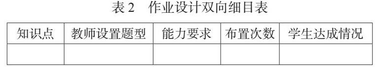 制定作业目标时,除了明确每一份作业的目标内容和认知要求外,还要标记每一个练习对应的目标,同时统计每个知识点出现的频率,使得作业更具有目的性和针对性,减少重复作业。因此,教师们可做作业设计双向细目表(表2):