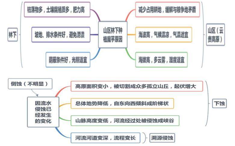 17题第(1)问通过审题干可知行为动词-简述,关键词为“山区”和“林下”,中心词-原因。通过调用所学知识可推知本道题考察农业的区位因素,再结合材料中魔芋的生长条件可构建如下思维导图: