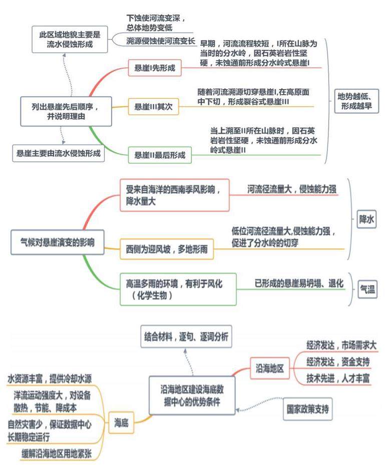 18题第(3)问通过审题干可知行为动词-简述,关键词-悬崖演变,中心词-影响。通过审材料,迁移气候对地理环境各要素的影响,构建思维导图如下: