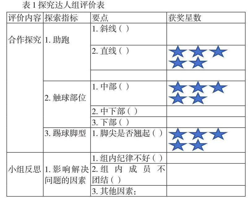 新课标指出:体育与健康课程根据体育学习实践性和健康教育实用性的特点,强调从“知识与技能为本”向“学生发展为本”的转变创设。倡导将教师的动作示范,重点讲解和学生的自主学习,合作学习,探究学习有效结合,将集体学练,小组学练与个人学练有机结合。因此在教学中,学生主要以小组合作探究学习方式为主。在设置探究问题时,首先:要从学生的实际情况出发,可以制成问题清单,让学生对照学习,体验成功,提高学习的自我效能感;其次:让每组的学生学会小组学习反思,升华学生探究能力。如表1:在足球大单元教学中,学习脚内侧踢球时。在做好课前的准备热身活动后,由小组长到老师那里领取探究达人组评价表,表中的评价方式权值都是5颗星,学生先探究,停止探究后,让学生结合教师的讲解去看小组探究结果是否正确,最后划星。