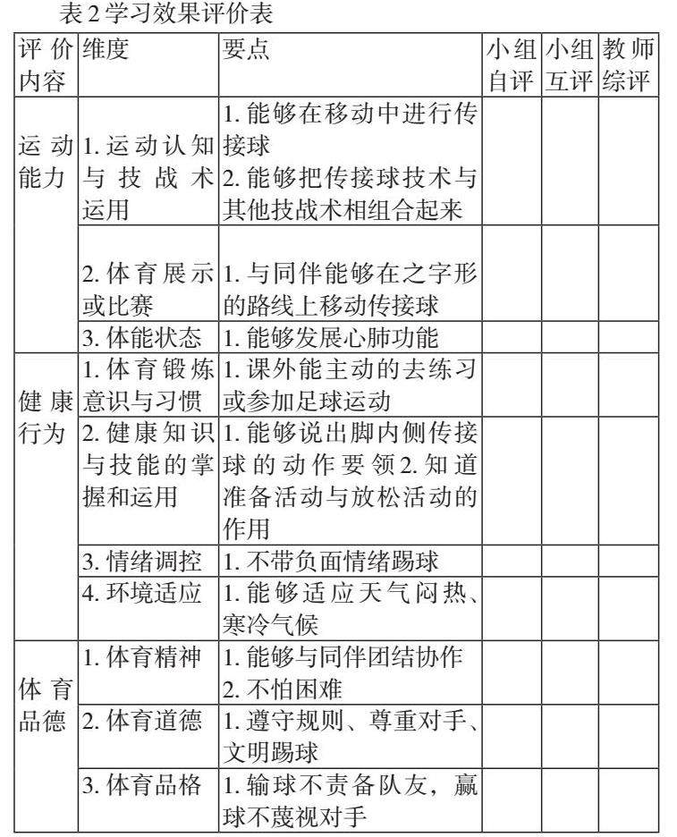 在新课标中明确指出:整个体育与健康课程课程目标是实现核心素养。核心素养内涵主要包括运动能力、健康行为、体育品德三个方面,共有10个维度。为了让课程的宏观目标落实到微观实处,新课标又对专项运动教学提出了要从基础知识与基本技能、技战术运用、体能、展示或比赛、规则与裁判方法、观赏与评价6个方面进行设计并对课程实施提出了具体要求。如:在水平二足球大单元教学中,学习脚内侧传接球。结合核心素养维度与水平二足球运动要求,设计学习效果评价表(具体设计见表2)。学生按照权重值为1-5分首先小组自评打分,然后在展示时进行小组互评,最后教师进行综合评价。