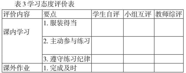 新课标中指出:落实“教会、勤练、常赛”要求,注重“学、练、赛”一体化教学。坚持课内外结合,巩固和运用所学运动知识与技能,参与各种比赛或展示。激发学生参与运动兴趣,让学生体验运动的魅力,领悟体育意义,逐渐养成“校内锻炼1小时、校外锻炼1小时”的习惯。为更好落实理念,设计课上学生在学习中对学习态度评价,进行当堂反馈,提高学生的学习认知;课外是否按时保质的完成作业的学习态度评价表。如:以在足球大单元教学中,学习第五课时:脚内侧踢球为例。