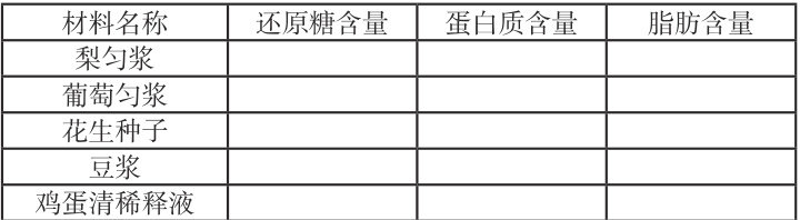 教师提供的实验材料如下:梨匀浆、葡萄匀浆、花生种子、豆浆、鸡蛋清稀释液。每个小组选择三种材料,检测该材料中的还原糖、蛋白质和脂肪(教师保证所有材料都有小组进行检测);并比较不同材料的还原糖、蛋白质和脂肪含量。