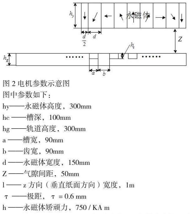 空芯永磁同步直线电机,作为永磁电动悬浮列车的驱动电机,在磁浮列车中有着重要地位。传统对于直线电机的研究大多限于含有铁芯的电机,故电磁计算相对较为简单,甚至可以采用估算的方式,且由于拥有磁路,无须考虑漏磁,永磁体采用 N,S 交错排列结构,因此电机结构也相对较为简单。本文研究电机没有铁心,没有较为成熟的解析计算公式,且由于为磁浮车驱动电机,故漏磁将对乘客产生身体伤害,故本文所研究电机,转子永磁体也不再如传统电机 N,S 交错排列结构,而采用了Halbach的磁体排列结构,这样又大大增加了电机复杂性[1,2]。