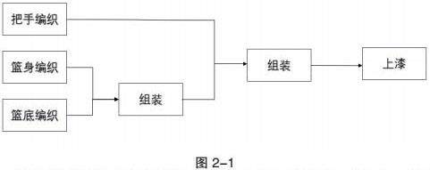 本文以竹编提篮的编织为例,该竹编提篮的制作流程如图2-1所示。该提篮的制作主要分为三部分六个环节。首先是把手、篮身和篮底三个部分的编织,其次是篮身和篮底的组装,再是把手和主体的组装,最后对成品进行上漆,自然风干后可以得到完整的产品。