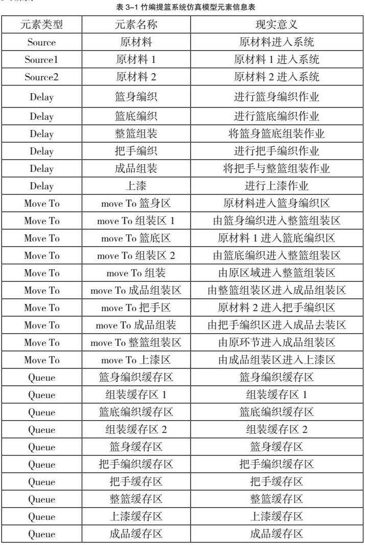在实现D企业的竹编提篮生产系统的仿真前,要明确该生产线的工艺流程,依照实际的生产流程生成各类实体元素。本仿真模型以实现D企业竹编生产系统中,从原材料进入到成品流出的这一生产物流过程。