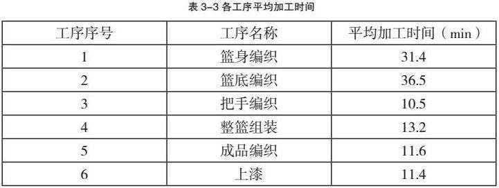 通过实地走访D企业的此生产线,我们了解到,该条生产线中,各个生产环节所需时长不一致,但各环节都仅有一位工人进行生产工作。在生产线流水化前,一件产品由一位工人独立完成,每天仅生产两三件产品。相比于原始生产方式,流水化生产能够为企业增加三到四件产品。从工艺角度来说,篮身和篮底的编织较为复杂,且均采用双面编织的手法,因此所需时间也是其他工序的两到三倍。就编织工人来说,掌握的技巧和手法也有所不同,生产速率也因此有些许差异。但是因为生产节拍不一致,车间内在制品积压严重,车间拥挤不便于生产物流的运作。