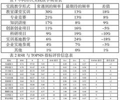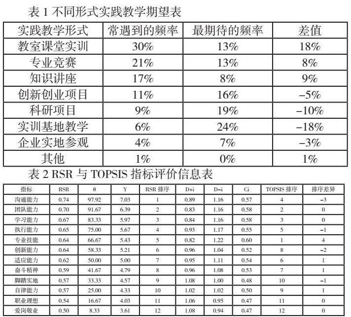 RSR和TOPSIS排序得到较为接近的评估结果。表2数据显示,团队能力、学习能力、执行能力、创新能力、适应能力、奋斗精神、脚踏实地、自律能力、职业理想、爱岗敬业等10个指标的排序基本一致,排序差异都在2个等级差范围内。沟通能力和专业技能的排名一个是第1与第4,一个是第5与第1。虽有所不同,但两者之间也不超出4个等级差范围。这些等级差异表明,学生对于实践教学的作用存在较为一致的看法。他(她)们认为,实践教学对能力型指标的促进作用靠前,而对精神型指标的作用靠后。