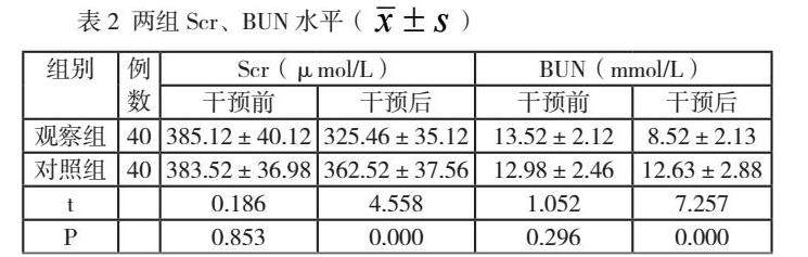 干预后,观察组Scr、BUN低于对照组(p<0.05),见表2。