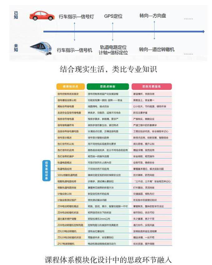 结合我校专业学生的学情分析前提下,设计课程标准对应的课程具体内容实施方案。在《信号基础设备维护》课程设计过程中,将学生们更为熟悉的生活事物与业知识内容,使用类比的方式进行体系化的展开与介绍,这样对于课程的整体认知就更易上手,对于课程各部分知识的前后续关系也清晰。同时,将课程体系对应的思政元素同步设计,将现有学生较为熟悉的人事物结合进入专业教学环节的设计中。