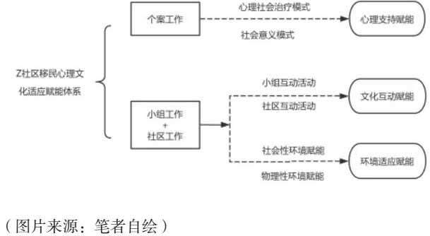 易地搬迁社区具备三个特征:一是强制性,在治理过程中带有一定的行政色彩;二是异质性,社区的人员构成具有混合性;三是过渡性,基本设施及治理机制不够完善,处在一个不稳定的阶段。[16]因此,针对搬迁移民在融入问题的诸多困境以及社区发展的程度,社会工作介入具有独特的专业优势,社区社会工作是一个综融性的实践领域,其在“助人自助”以及“利他主义”的理念下回应个体、家庭和群体的困难和需求,以优势视角挖掘个体潜能。[17]其多元化的服务方法是实现服务对象个体与环境之间的良性互动的桥梁,在社区治理方面,社会工作与社区组织联动从而实现社区治理机制创新。针对Z社区关于心理文化适应方面的上述困境,社会工作实务综融个案、小组和社区三大方法,从心理支持、文化互动和环境适应三方面为移民赋能,其中各个维度又包含不同的模式和层次,各方面协同作用,共同构成了促进Z社区移民文化心理适应的赋能体系。具体行动图式为:
