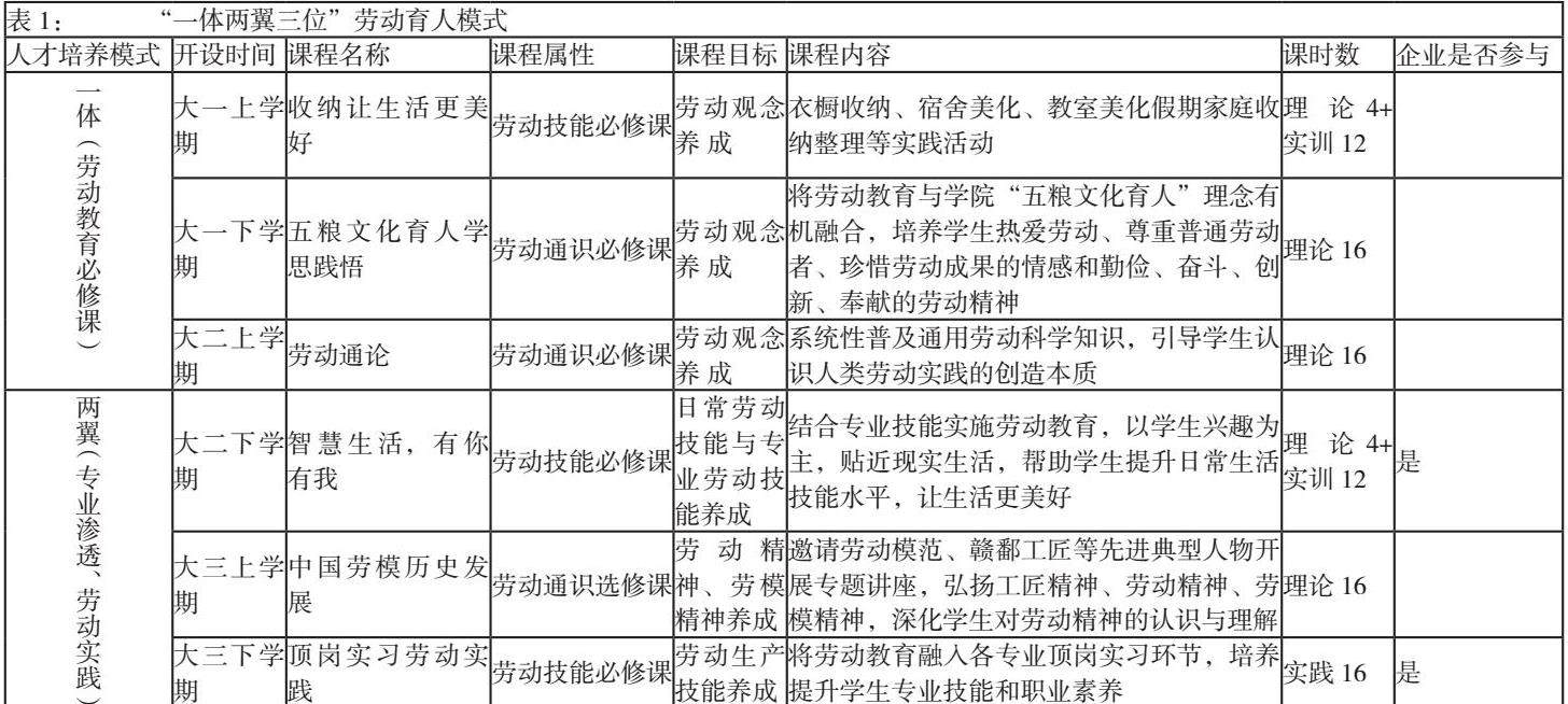 “一体两翼三位” 劳动育人才模式创新是指创建新时代下的以劳动教育必修课为主体,专业渗透、劳动实践为两翼课程体系,构建“校、企、生”三位一体的劳动育人培养模式。以我院为例,见表1