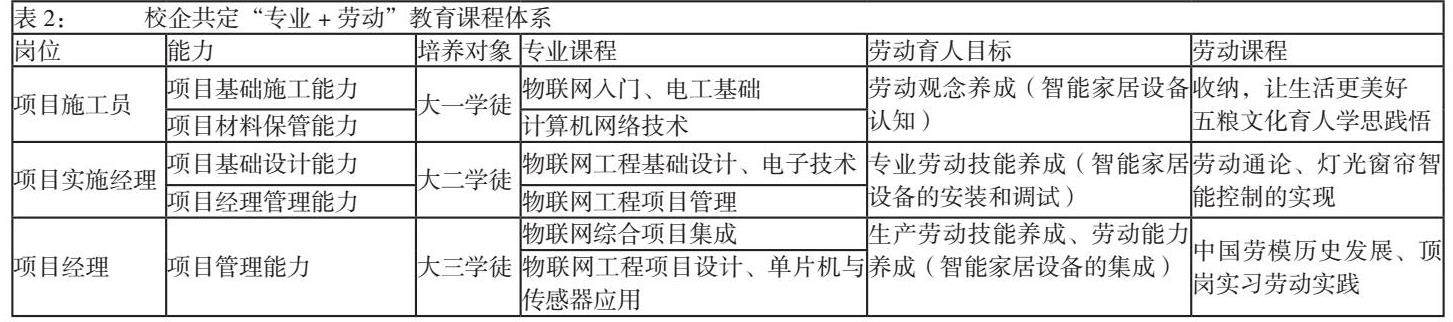 以提高人才培养质量为切入点,以培养岗位就业能力和劳动能力为出发点,将劳动与生产技术相对接,变革课程体系。即依据企业就业岗位、需要具备的岗位能力、劳动态度、劳动能力不同,重新构建课程体系,创建“专业+劳动”课程体系,解决劳动能力缺失问题。以信息工程系物联网专业为例,见表2: