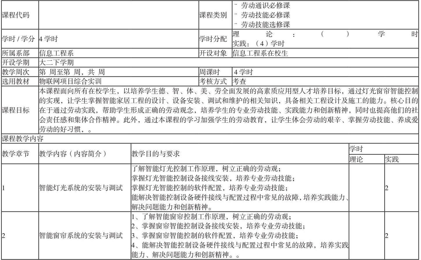 课程目标 本课程面向所有在校学生,以培养学生德、智、体、美、劳全面发展的高素质应用型人才培养目标,通过灯光窗帘智能控制的实现,让学生掌握智能家居工程的设计、设备安装、调试和维护的相关知识,具备相关工程设计及施工的能力。核心目的在于通过劳动实践,帮助学生形成正确的劳动观念,培养学生的专业劳动技能、实践能力和创新精神,同时也提高他们的社会责任感和集体合作精神。此外,通过本课程的学习加强学生的劳动教育,让学生体会劳动的艰辛、掌握劳动技能、养成爱劳动的好习惯,。