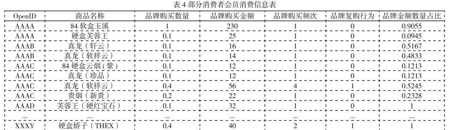 本课题通过品牌购买数量、品牌购买金额、品牌购买频次、品牌金额数量占比和品牌复购行为来测算不同消费者对于不同品规卷烟的品牌忠诚度,对消费者OpenID代码使用虚拟代码替代,部分经过数据预处理后的消费数据如表3所示: